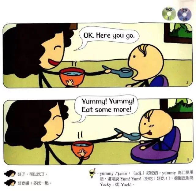 "Yummy! Yummy! Eat more!"(好吃喔!多吃一点。)